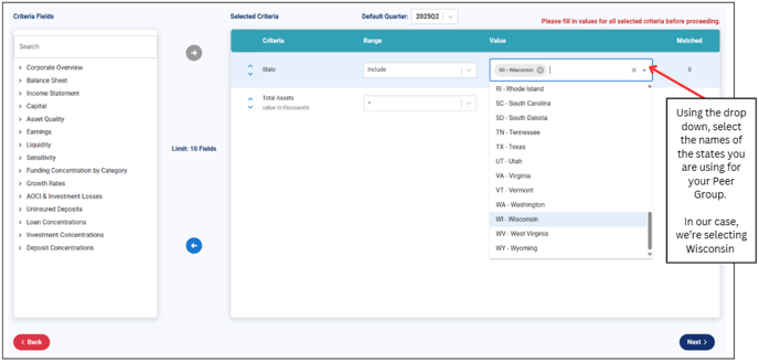 Using the drop down, search for and select the bank you would like to add to your Peer Group: