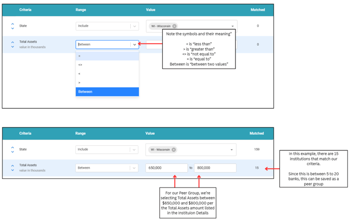 We will also search for and add Total Assets into our list. We will enter an asset size between $650,000 and $800,000 per the Total Assets amount listed in the Institution Details: