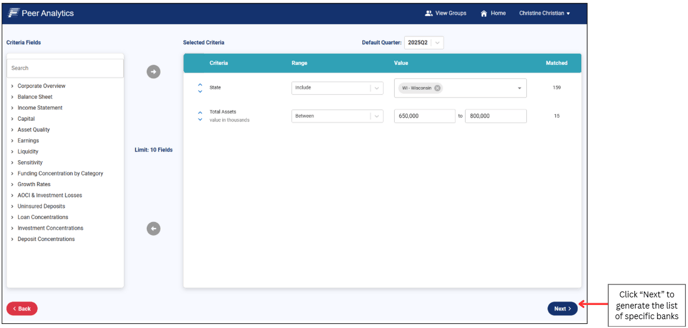 - Since we have 15 banks that match our criteria, we can click proceed with viewing creating our Peer Group.