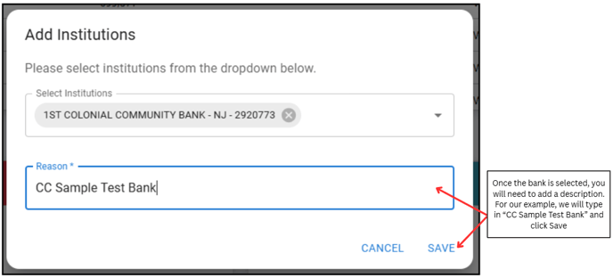 Once the bank of your choice is selected, enter a description of why you are adding the bank to the group and click "Save":