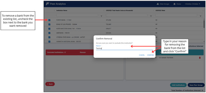 To remove a bank from the list, simply uncheck the box next to its name and enter a reason for the removal. This reason will be visible to all of the users in your tenant who view the Peer Group.