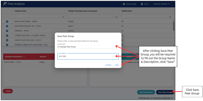 Once you are satisfied with the Peer Group criteria & details, click "Save Peer Group". You will then be prompted to fill out a Group Name and Description prior to saving the group: