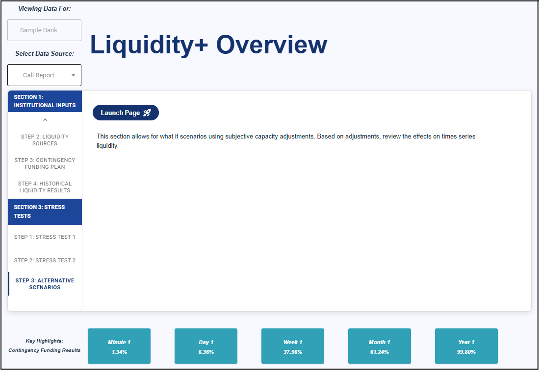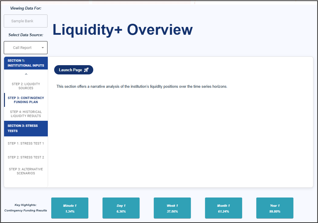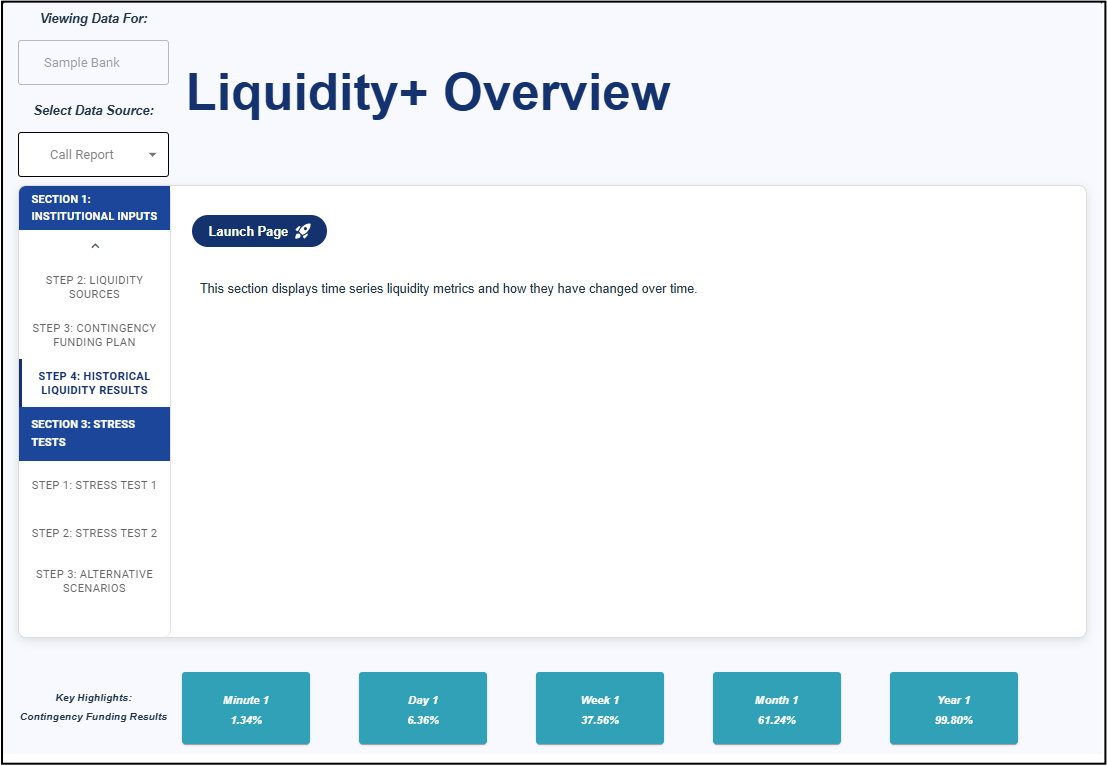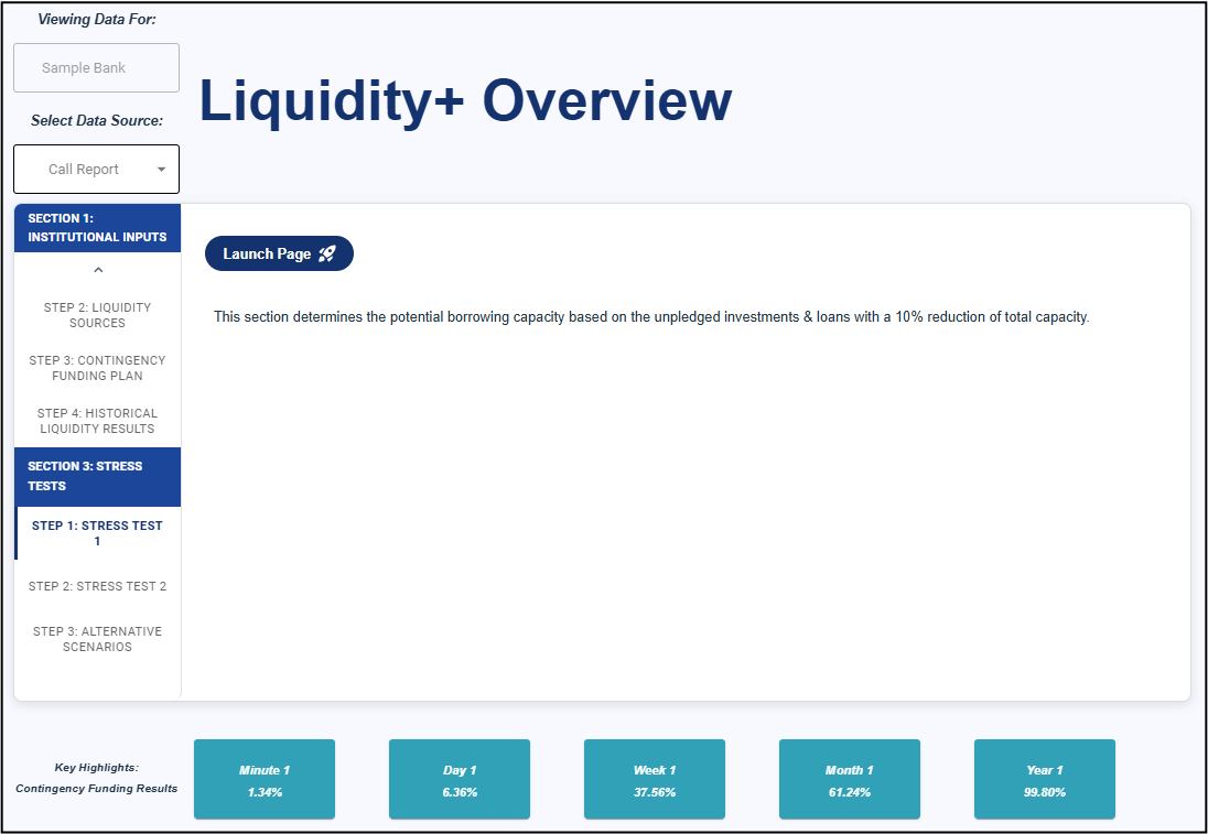 The Liquidity+ Overview page will default to Step 1 of Section 1: Institutional Inputs. Clicking "Launch Page" will take you to Policy Limits:
