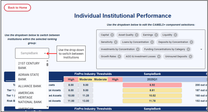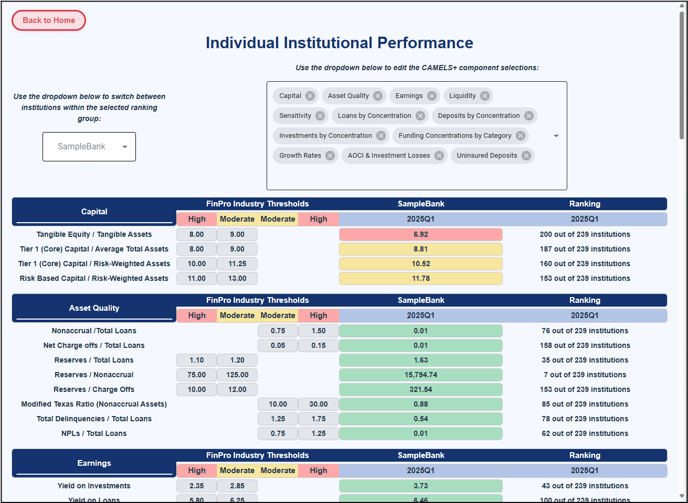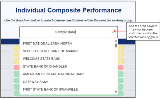 This step displays the individual CAMELS+ metrics for any of the institutions in the selected ranking group. It also displays the ranking of the institution shown within the selected ranking group.