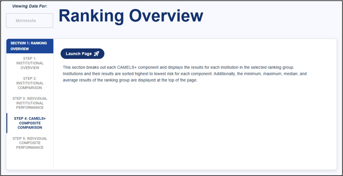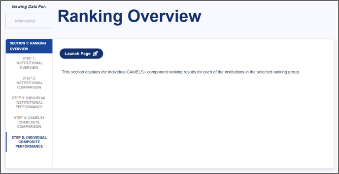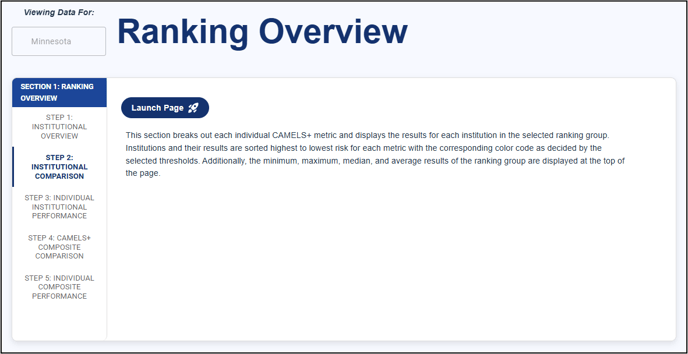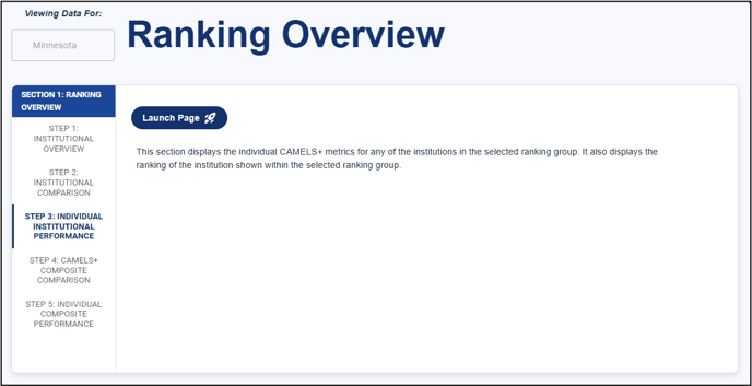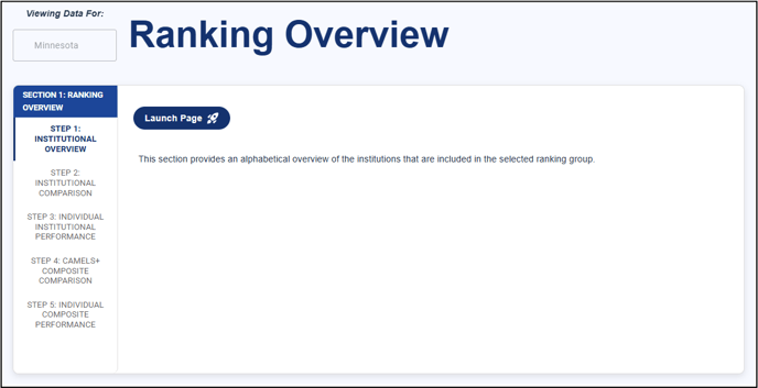 The Ranking Overview page will default to Step 1 of Section 1. Clicking "Launch Page" will take you to the Institutional Overview: