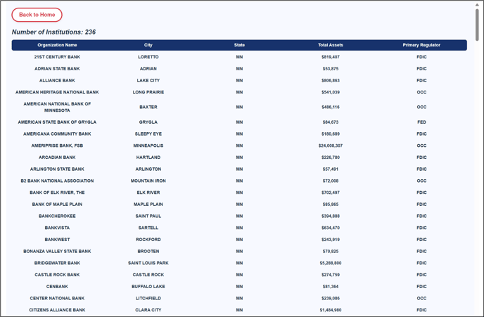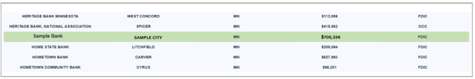 At the top of the page, you will see the minimum, maximum, median, and average results of the ranking group. Directly below these results, you will see each individual CAMELS+ metric and the results for each institution in the ranking group.