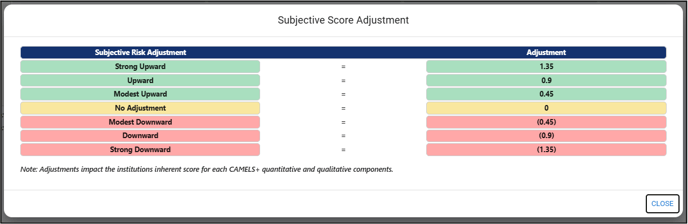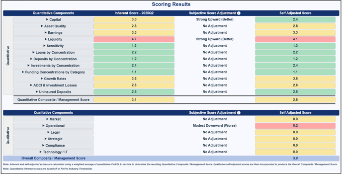 This step displays the quantitative and qualitative CAMELS+ components along with the current quarter’s inherent score, subjective score adjustments and the institutions self-adjusted score.