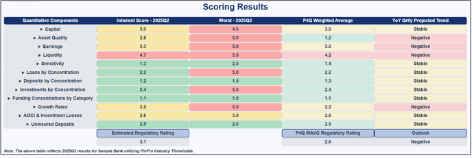 This step displays the CAMELS+ components along with the current quarter’s inherent and worst score, as well as the previous 4 quarters' weighted average and the year over year quarterly trend.