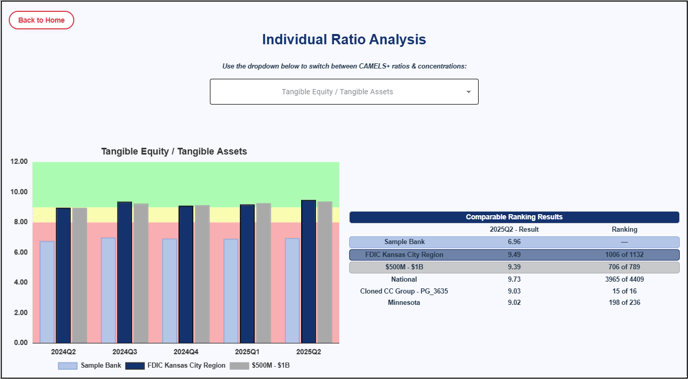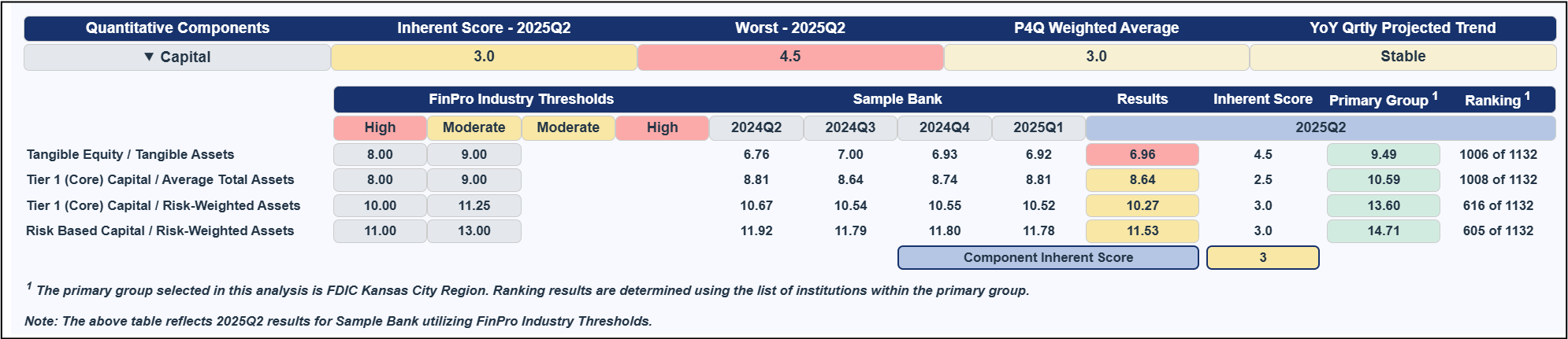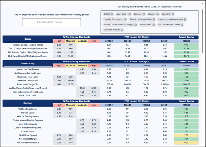 This step breaks out each individual CAMELS+ metric and displays the institution’s result against both median group results for the current and previous four quarters.