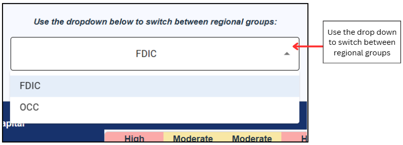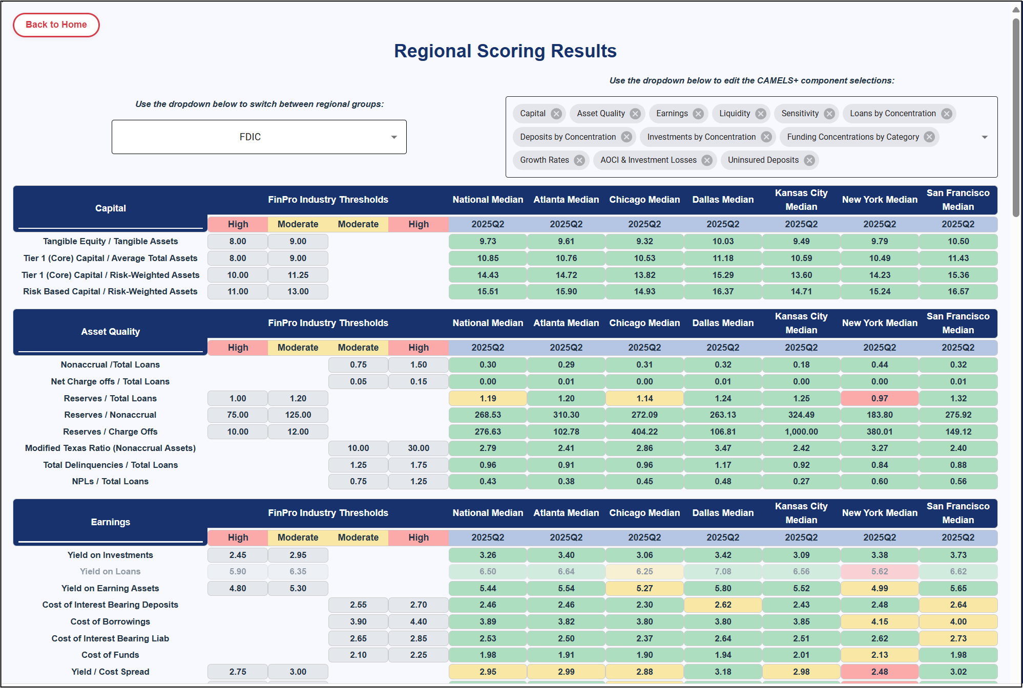 This step is institution agnostic and displays the median individual CAMELS+ metrics for all FDIC insured banks, as well as the medians for each FDIC supervisory region.