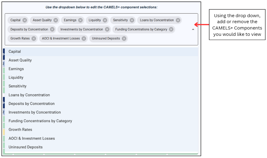 Use the drop down on the right to add or remove the CAMELS+ components you would like to view.