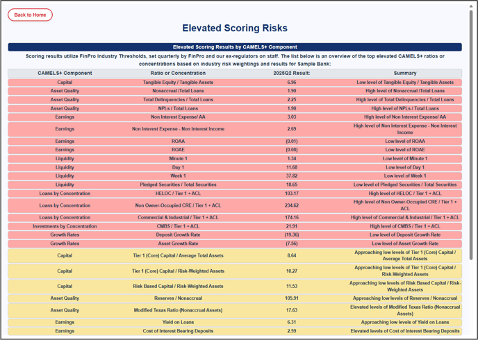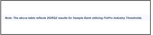 This step highlights the individual metrics that are considered high or moderate risk based on either FinPro Industry Thresholds or Institution Provided Thresholds. Metrics are grouped by risk level, followed by CAMELS+ factor.