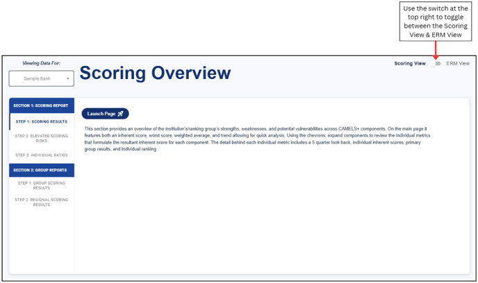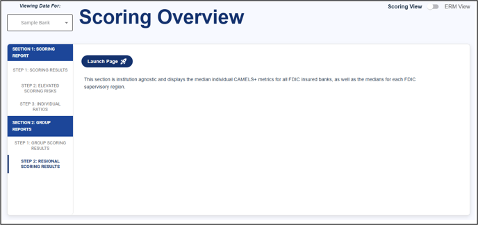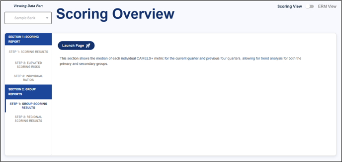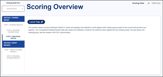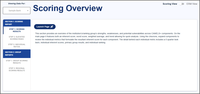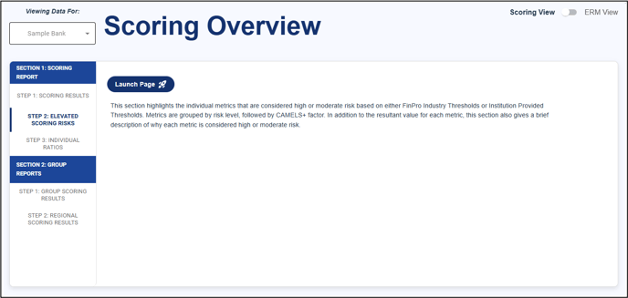 - The Scoring Overview Page houses Scoring Results, Elevated Scoring Risks, Individual Ratios, Group Scoring Results, and Regional Scoring Results.