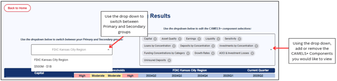 Use the drop downs to switch between Primary and Secondary groups as well as adding or removing the CAMELS+ Components you would like to view. Use the drop down on the right to add or remove the camels+ components. You may also simply x out of the components you would like to remove from the screen.