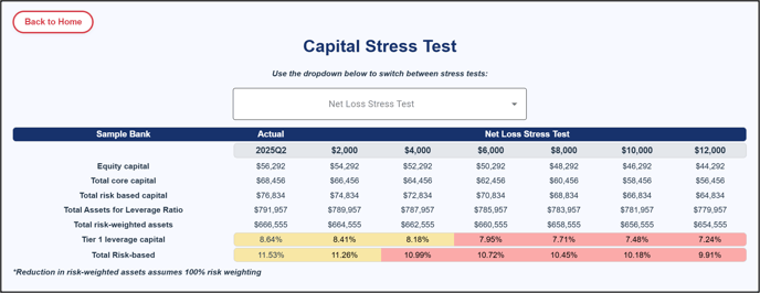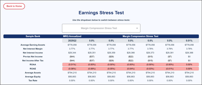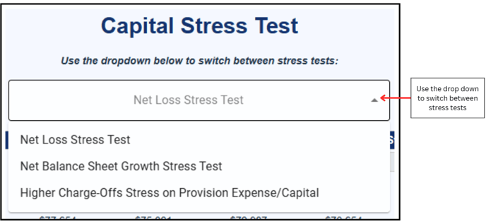 The Stress Test model runs simple single-variable stress tests and displays their impacts on earnings and capital ratios.